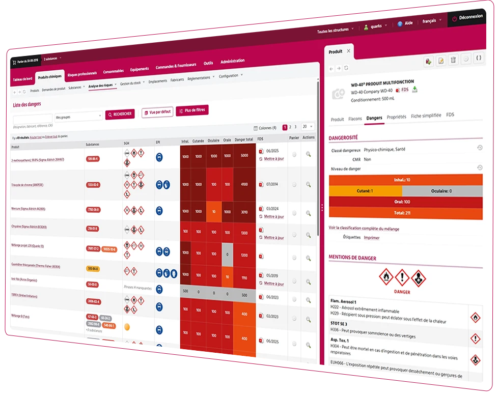 Quarks Safety digitalise la gestion des risques chimiques et professionnels, du stockage à l’étiquetage CLP, en passant par le DUERP, les FDS, et plus encore.