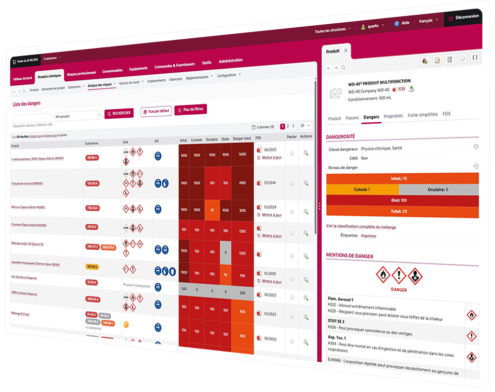 Notre plateforme Quarks Safety intègre des milliers de données réglementaires et techniques, actualisées en continu. Bénéficiez d’un accès centralisé à plus de 340 000 substances surveillées et à l’ensemble des réglementations majeures, pour garantir à votre entreprise un pilotage serein des risques chimiques, quel que soit votre secteur d’activité.